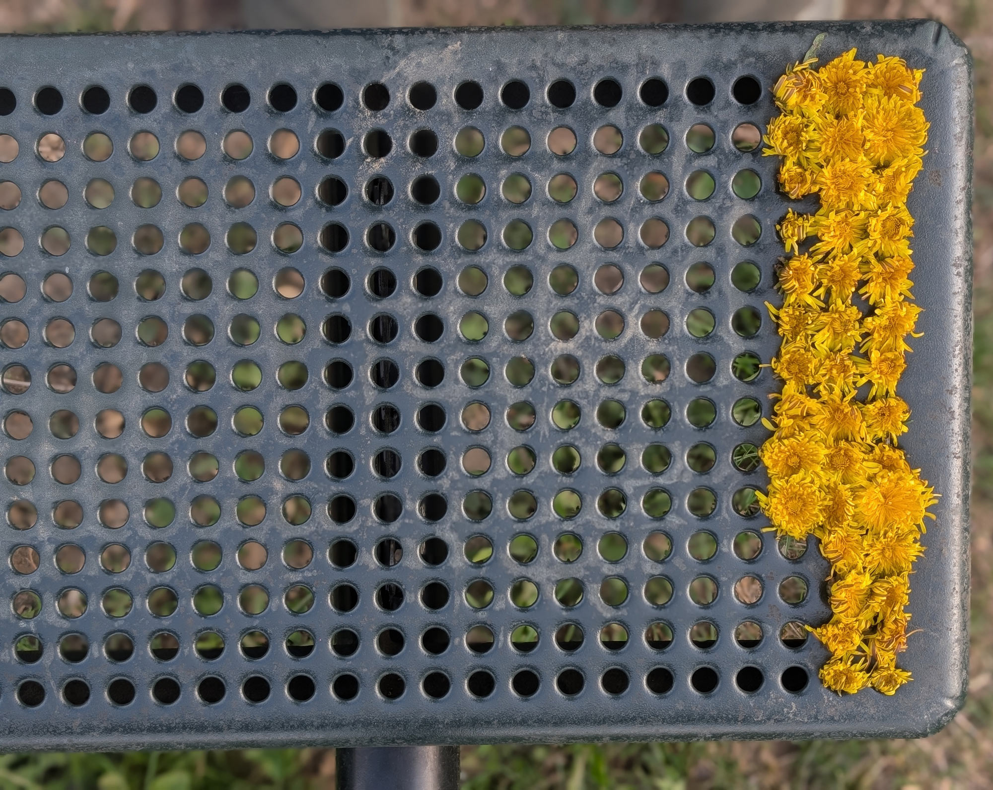 I was smiling while picturing the scene where some kids were running back and forth from the grass nearby, where they picked the dandylions, to the bench where they meticulously placed them in the lines of holes on the bench.