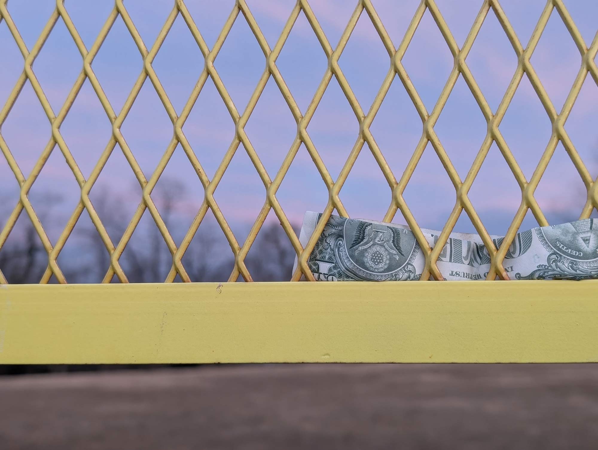 I found this dollar bill that has been blown up against the outfield fence of the baseball park where I take the dogs to let them run around. I folded it up and weaved it through the mesh of the screen attached to the first base foul pole. This was about 3 months ago.