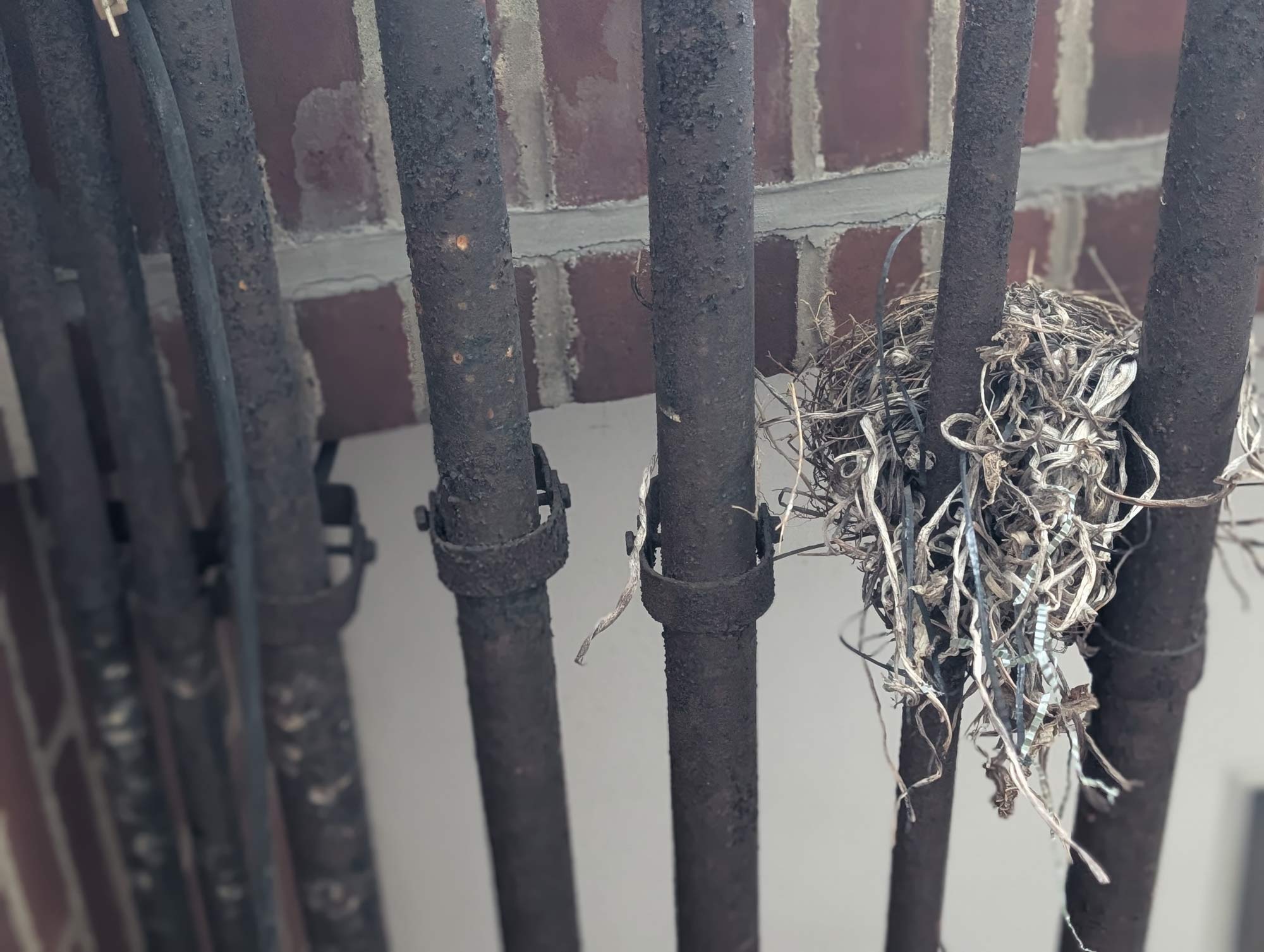 The pipes that this nest rest on are connected to the back of a building that is part of a county court house complex. If you look closely you can see that part of the nest is made out of strips of paper that have gone through a shredder. Were they found by the bird in a nearby dumpster? I wonder what was in those documents that those strips came from. Divorce decrees? Wedding applications? Eviction notices (someone losing their "nest")?