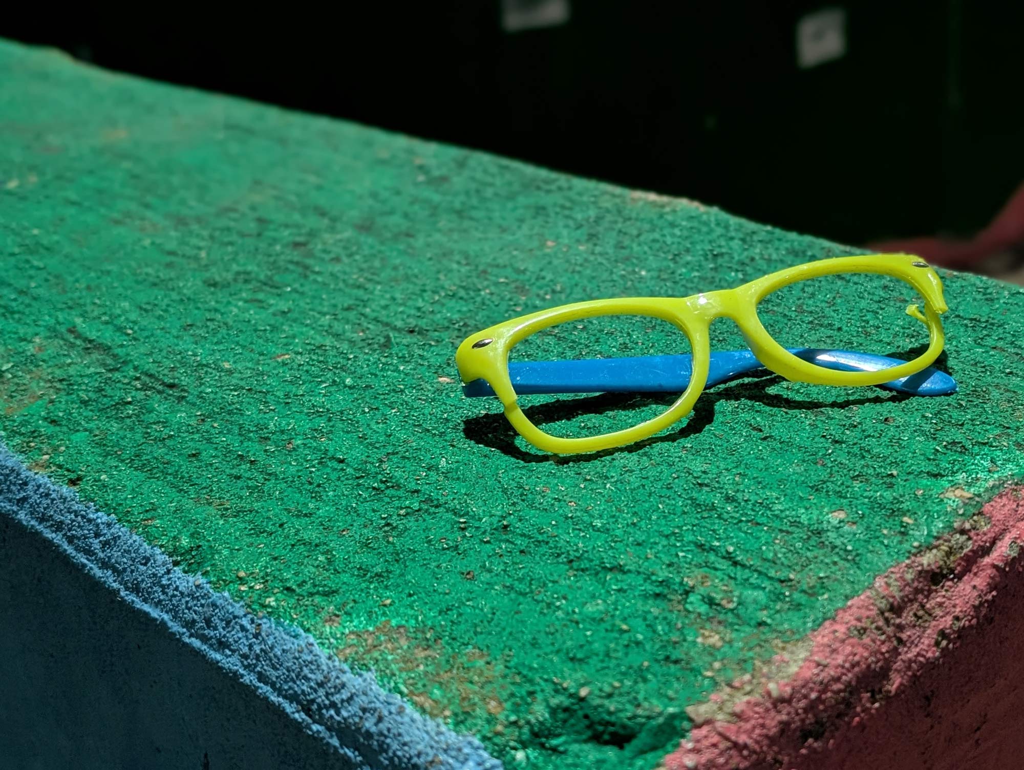 I think it's safe to assume that the lenses that were in these frames before they were broken were either mirror or dark. I mean yellow frames with blue temples — these aren't glasses, they're shades.