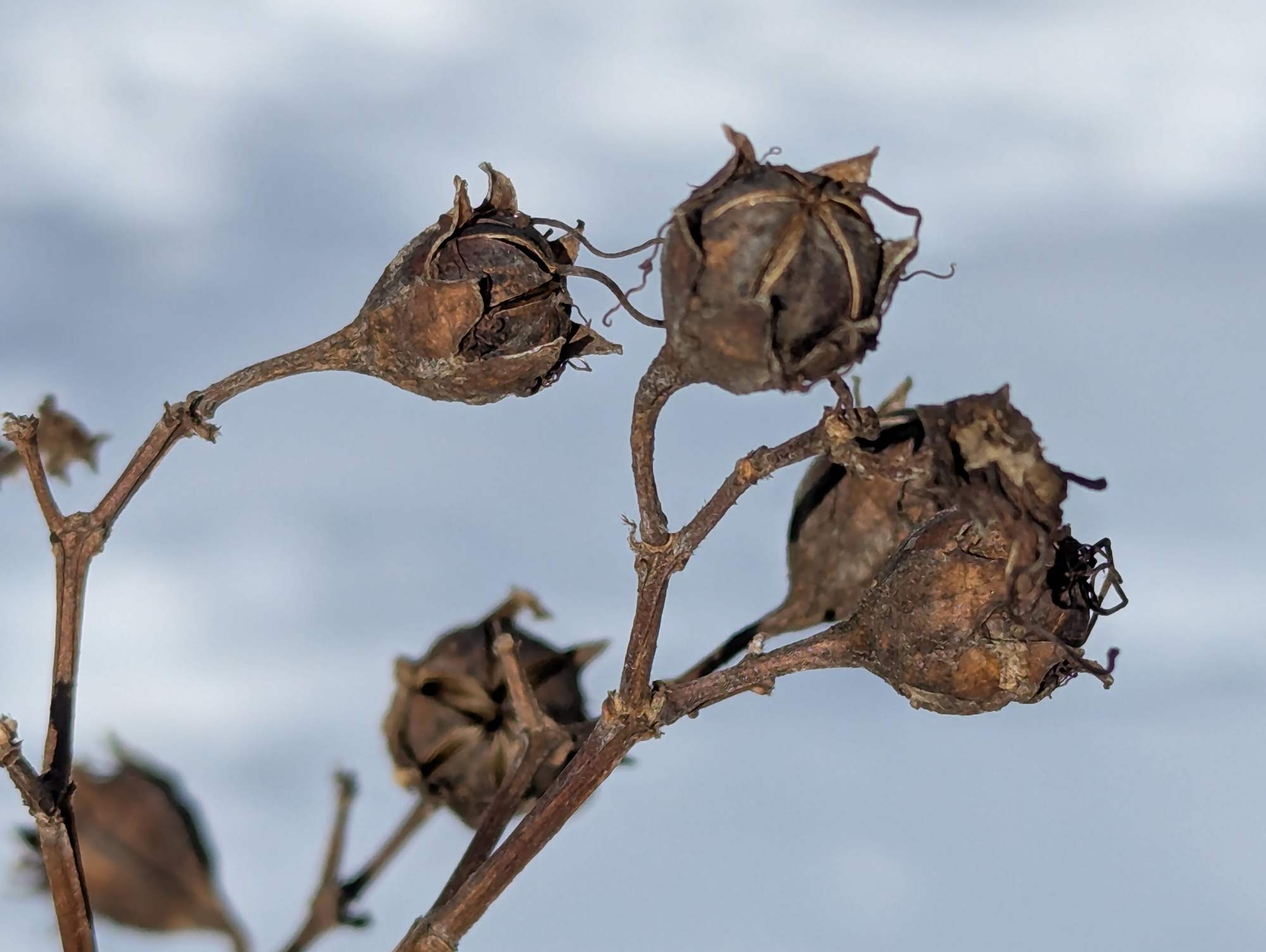 It's easy to walk by this little tree that we just planted the past Spring and ignore what looks like a dead, brown, dried out bunch of sticks. But, taking a closer look there's beauty to be found there. The buds that look like sleigh bells. The little tendrils that extend off of the buds.